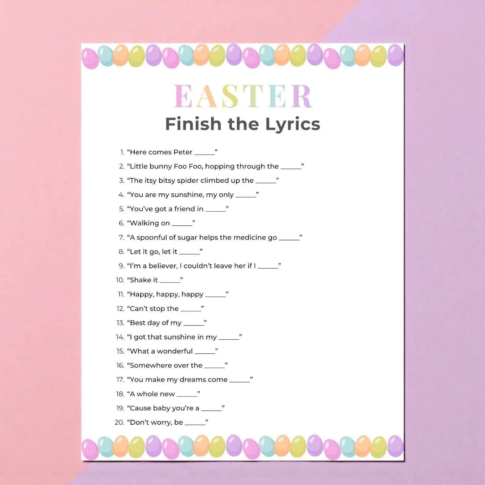 Music games always bring laughter to a party, and this Easter Finish the Lyrics game adds a fun Easter twist.