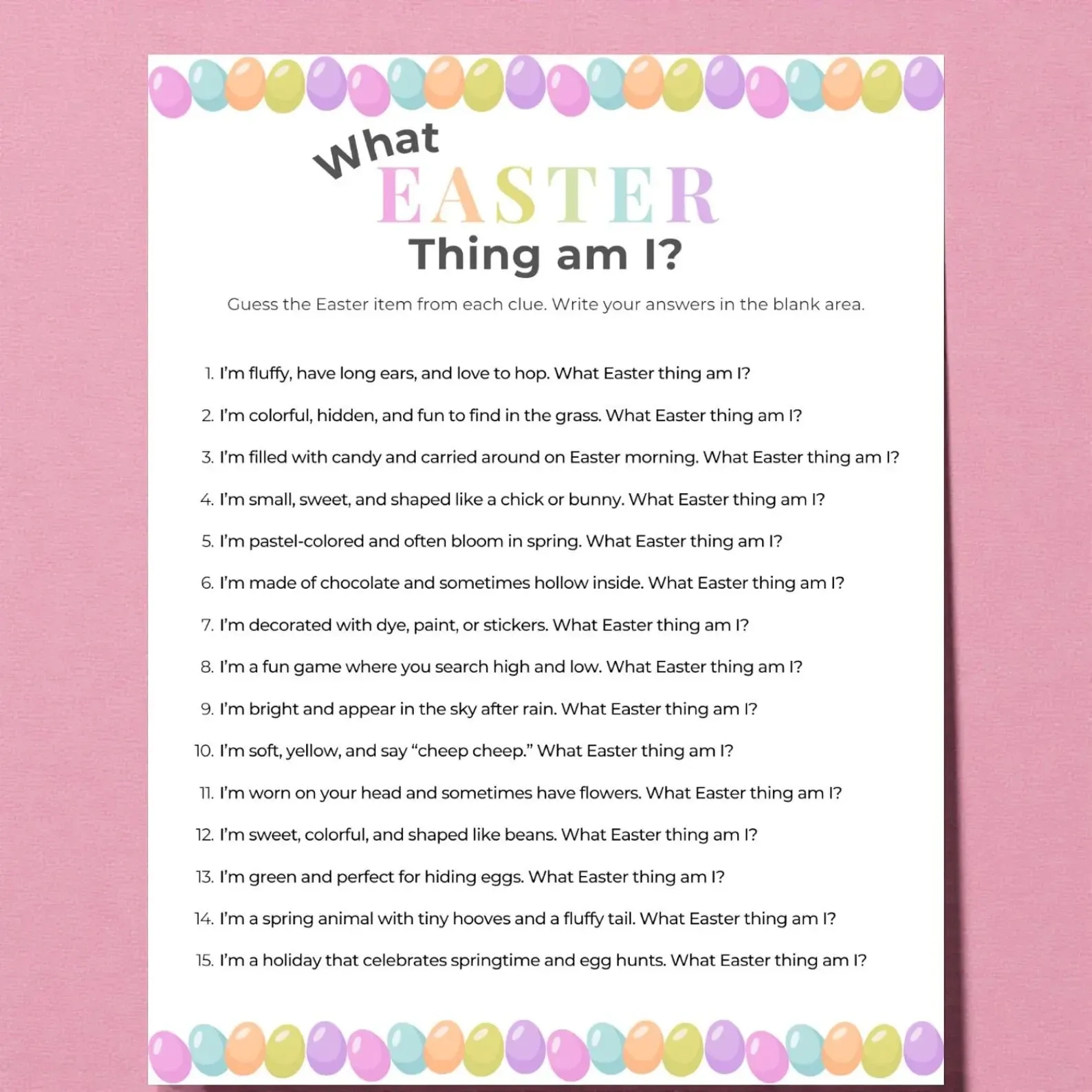 This Easter What Am I game is a fun riddle-style challenge that works for both kids and adults. Each clue describes a common Easter item, and players must guess the correct answer.