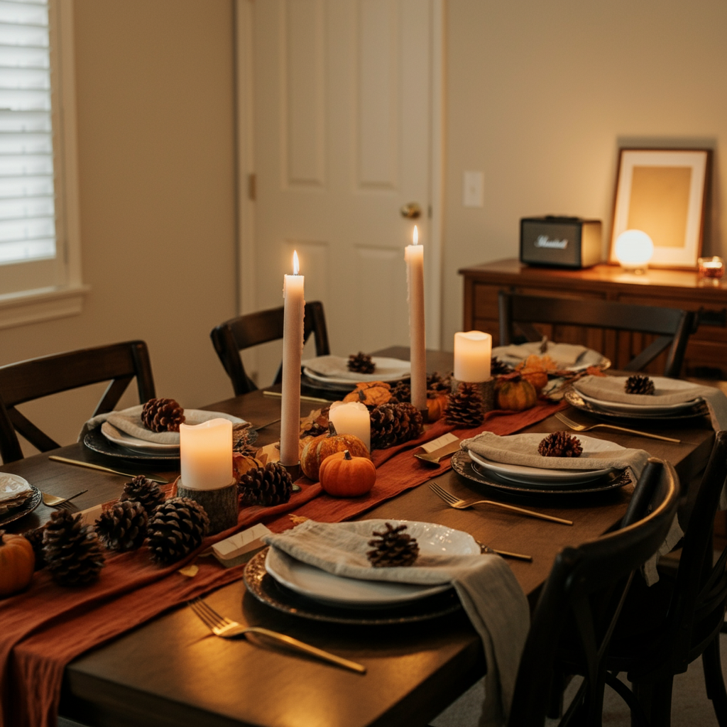 How to do it: You don’t need to go overboard. A simple table runner in fall colors, some scattered pine cones, and plenty of candles create instant warmth. Before the party, create a playlist of favorite songs that feels festive but won't overpower conversation. Dim the lights slightly just before guests arrive to create a cozy vibe.