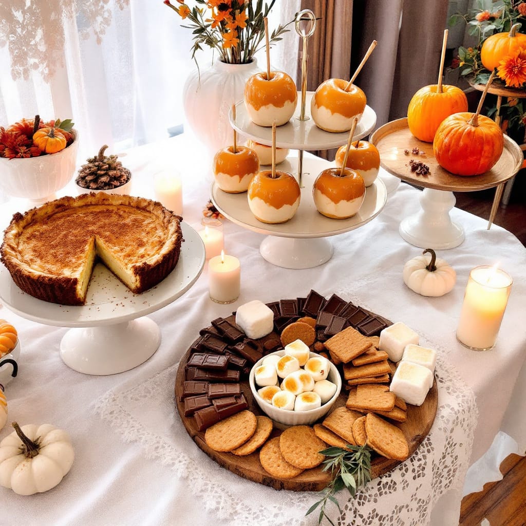 Dessert is your chance to fully embrace the sweet side of the season. An artfully arranged dessert table can also serve as a beautiful piece of decor. Offer a variety of treats, from apple pie and pumpkin cheesecake to caramel apples. You can also create a s'mores board with different types of chocolate and graham crackers, especially if you have a fire pit.