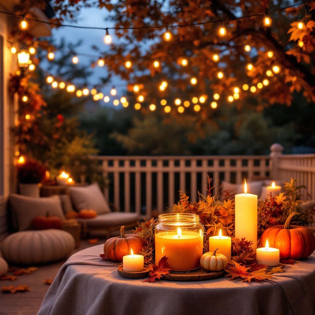 Lighting has a massive impact on the mood of an event. Avoid harsh overhead lights and opt for a warmer, softer glow. String lights are perfect for both indoor and outdoor spaces, creating a magical, twinkling effect. Place candles (real or flameless) around the room—on the coffee table, mantel, and side tables—to cast a beautiful, flickering light. A fall-scented candle with notes of pumpkin spice or cinnamon can also help set the mood.