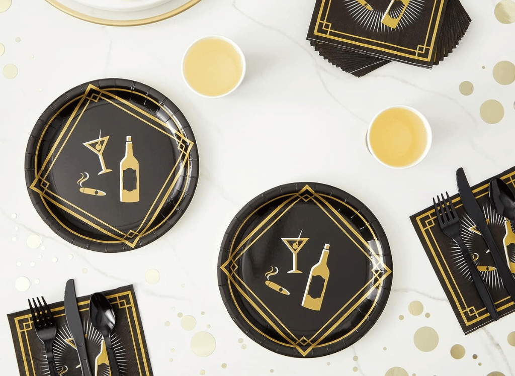 BLUE PANDA 144 Piece 1920s Dinnerware Set includes everything you need for a stylish and hassle-free celebration. With 24 each of paper plates, napkins, cups, knives, forks, and spoons, totaling 144 pieces, you'll have all the essentials covered. The paper plates and napkins feature a chic art deco design with gold accents on a black background, adding a touch of glamour to your event. Made from premium paper, these party decorations are reliable and won't easily fold or tear. And the best part? You can enjoy the festivities without worrying about clean-up - simply dispose of the plates and utensils after use!