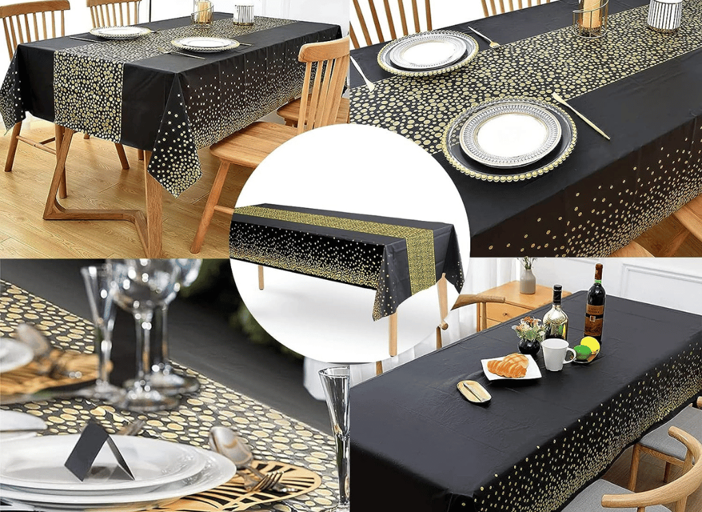 10. FECEDY 6 Packs 54 inches x108 inches Gold Wave Point Black Disposable Plastic Table Cover