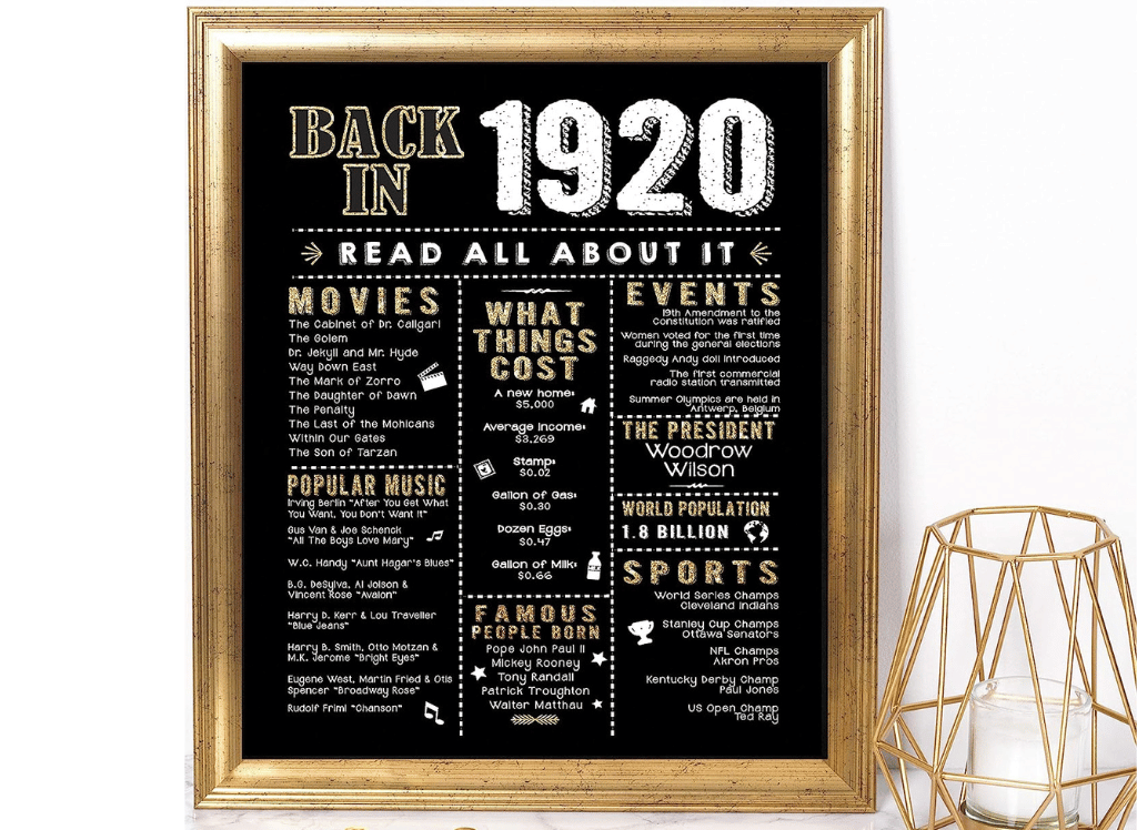 Get the best roaring 20s party decorations or great Gatsby party decorations with this exclusive Back in 1920 sign by Katie Doodle! It's the perfect conversation piece for any room. Your guests will love reminiscing about popular 1920s events, movies, music, and facts. This sign perfectly complements any 1920s party decor or great Gatsby party supplies. Amazing print quality on 8x10" premium cardstock (unframed).
