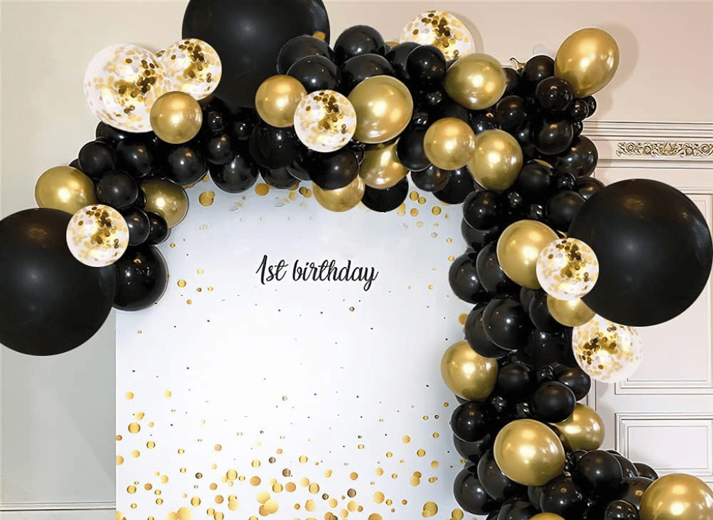This amazing package includes 114 balloons in 4 different sizes: 4 large 18-inch matte black balloons, 20 shiny 12-inch gold metallic balloons and gold confetti balloons, 50 stylish 10-inch gold metallic balloons and black balloons, and 40 cute 5-inch gold metallic balloons and black balloons. Not only that, but you also get a 16ft balloon garland decorating tape and glue dots to help you set it up effortlessly. These latex balloons are made from durable and non-toxic material, ensuring safety and durability. You can even stick them on walls, windows, or doors for that extra touch of decoration!