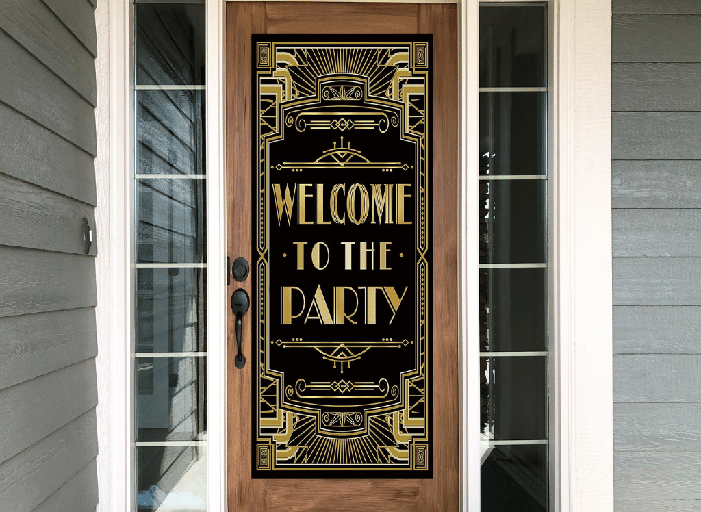 Step into the grandeur of the 20s with this vintage Gatsby-themed door cover! Made of durable vinyl, it's seamless, reusable, and non-reflective. Perfect for festive occasions, weddings, photo studios, or family party nights. Complete with Art Deco Jazz 1920s photo booth props, this backdrop adds a touch of elegance. Approximate size: 70x30 inches. Welcome your guests to the party with the musykrafties "Welcome to The Party" door cover!