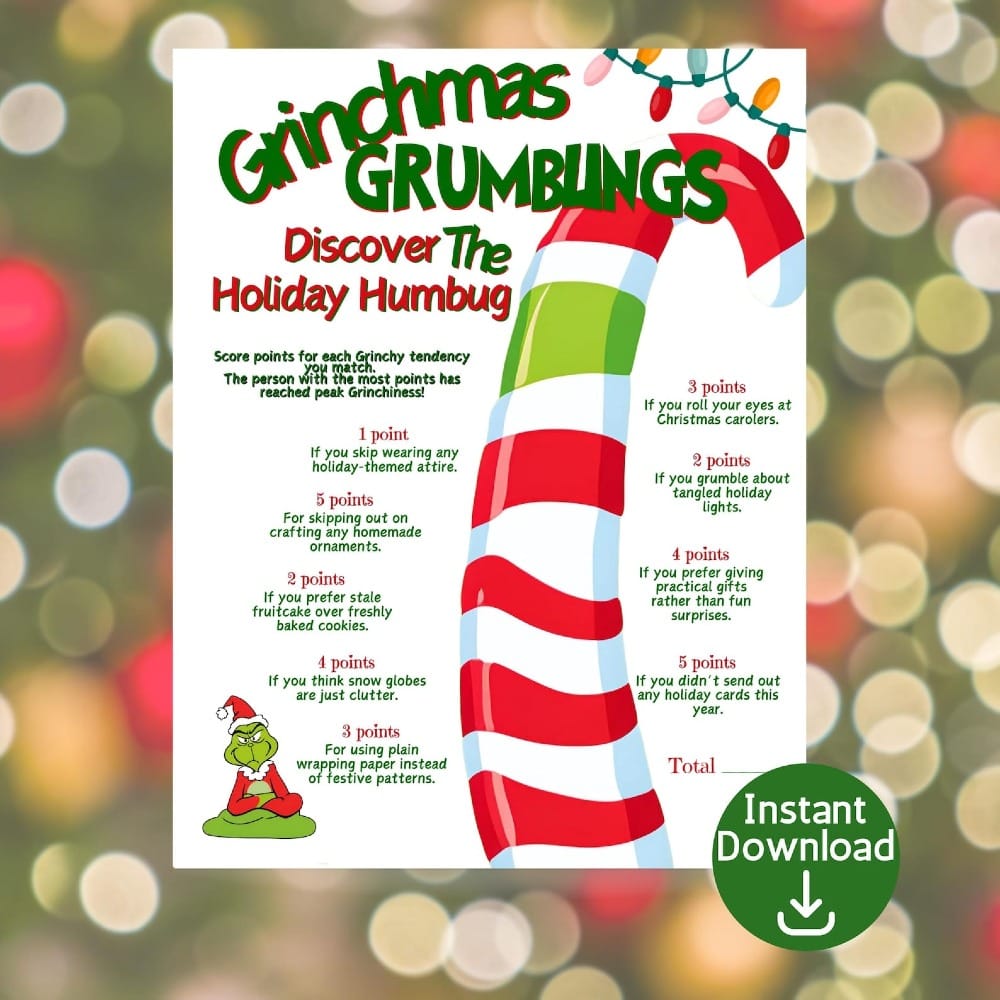 Think youβve got a Grinch hiding in your group? Find out with Grinchmas Grumblingsβthe hilarious printable Christmas party game that crowns the ultimate holiday humbug!