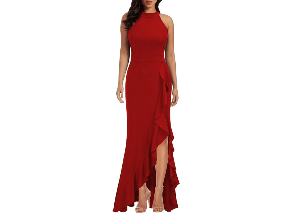 Step into the spotlight this holiday season with the stunning WOOSEA Women's High Neck Cocktail Dress! This fabulous frock is made with a blend of Polyester and Spandex, offering you all the stretch and comfort you need to dance the night away. The A-line silhouette flatters any body type, while the body-con wrap waist and high-waist design accentuate your curves. The split mermaid hem and ruffle details add a playful yet chic touch to the solid color ensemble. And oh, the color! The vibrant red shade is just perfect for any holiday party, ensuring you'll be the bell of the ball!