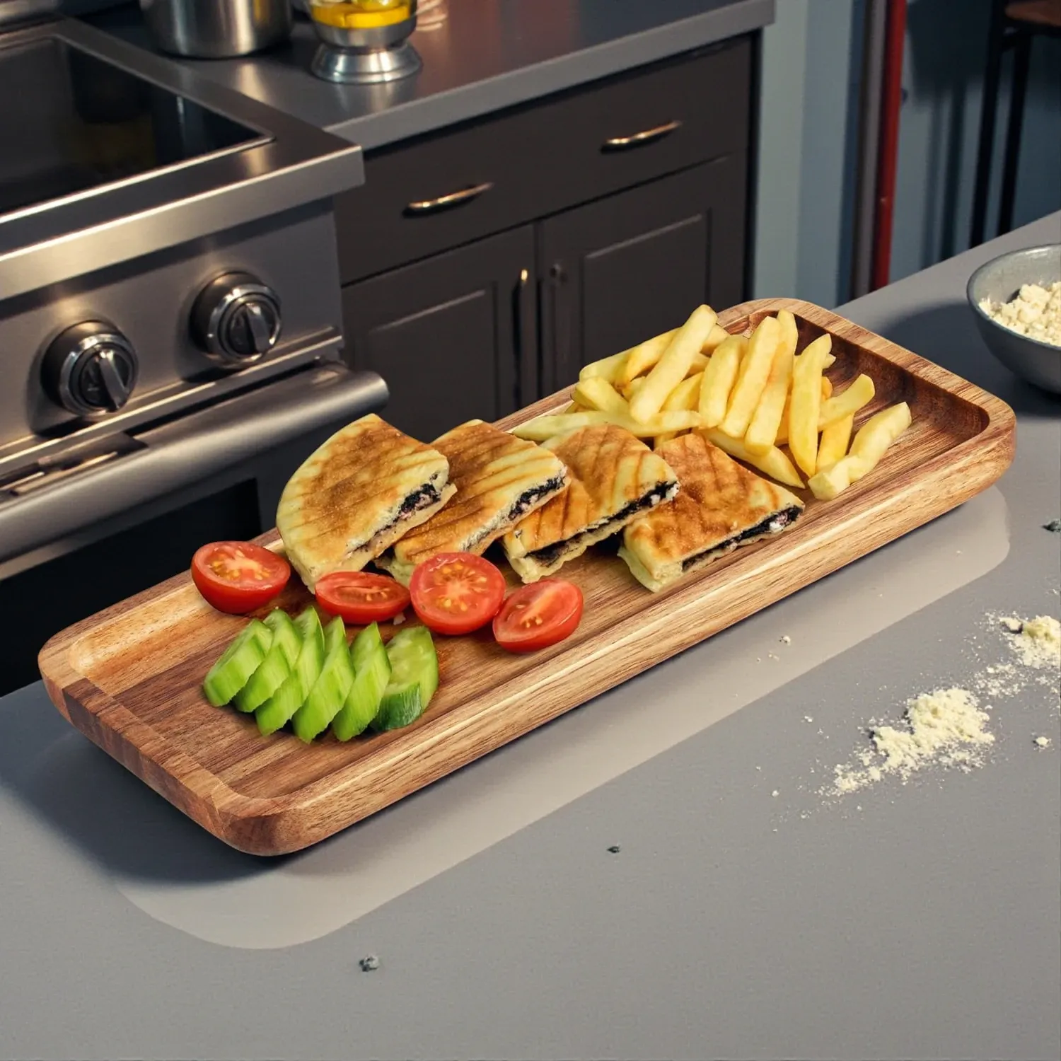 A large wood serving board is one of the most practical hosting essentials you can own. It works for appetizers, bread, cheese, nuts, desserts, or even as a casual centerpiece.