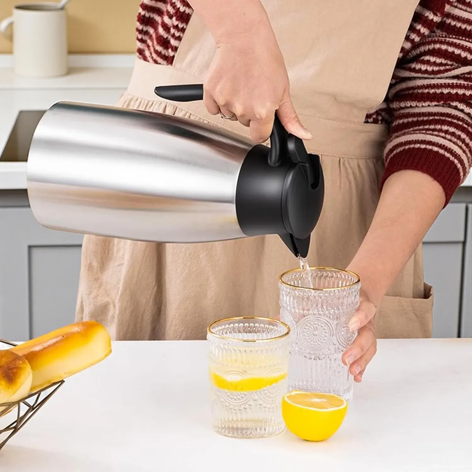 A clear glass carafe or beverage dispenser instantly elevates the table while reducing host stress. It’s practical, elegant, and keeps guests from interrupting the flow of the evening.