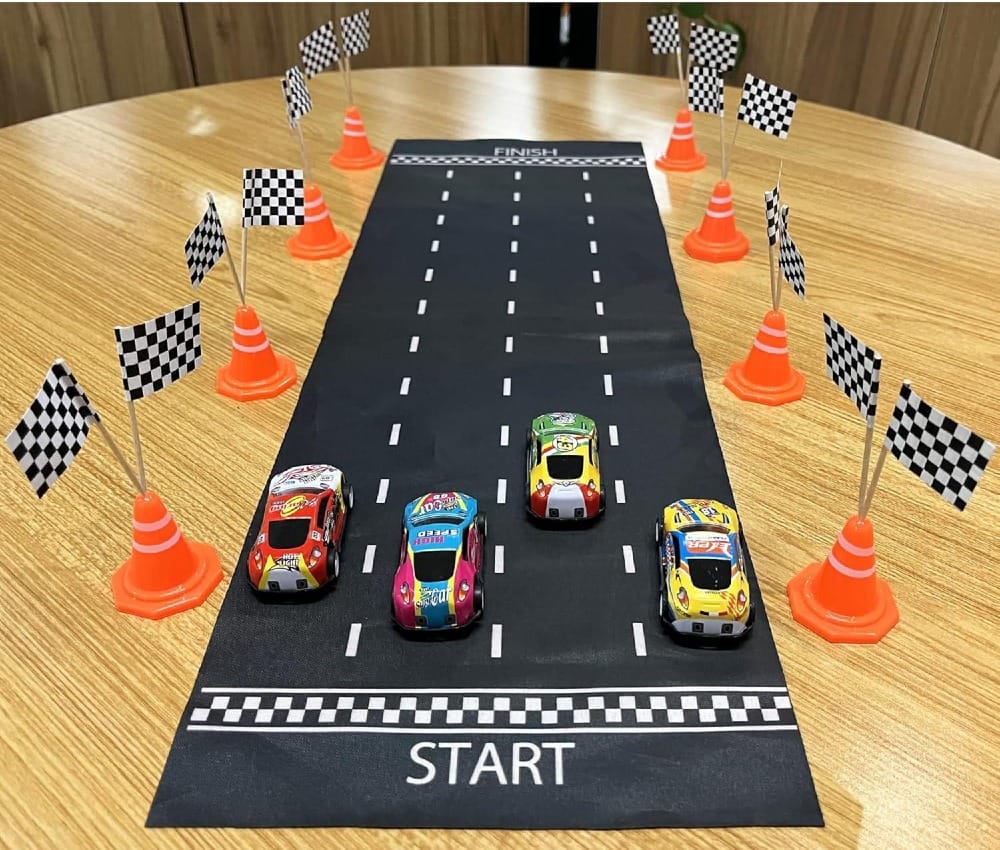 - Flag Decorating Station – Set up a craft area where kids customize their checkered flags with markers and stickers. Once completed, they can use their flags to cheer on their friends during the races.
