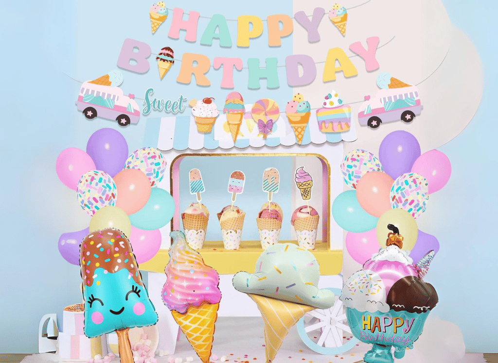 Plan ahead by securing ice cream birthday decorations like balloons, banners, and cupcake toppers. Create a setup that allows for easy access to toppings and ensure you have enough scoops and cherries for everyone.