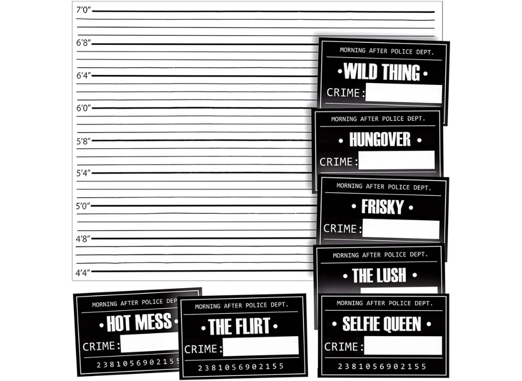 Have a great time with your friends as you recreate the classic mug shot scene with this 25 piece set of hilarious signs! With titles like “Total Diva”, “Hot Mess”, “Party Crasher”, and more, you can easily create unforgettable photo booth backdrops while your guests fill in their “crime” on the provided white-space, creating hilarious memories and plenty of smiles. Get ready to get into some Jersey Shore style mischief and have a blast with your friend- no regrets, no drama!