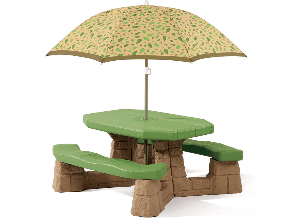The Step2 Naturally Playful Picnic Table with Umbrella is perfect for families or friends looking to enjoy a meal together outside. This realistic sandstone and paver styled picnic table includes a removable 5 ft wide umbrella, and has wide contoured benches that can comfortably seat up to six children. The rugged molded plastic construction ensures the table is easy to clean and resistant to fading from exposure to sunlight. It’s great for picnics, outdoor games, art projects, and more! Maximum weight capacity of 300 lbs; minimal adult assembly required.