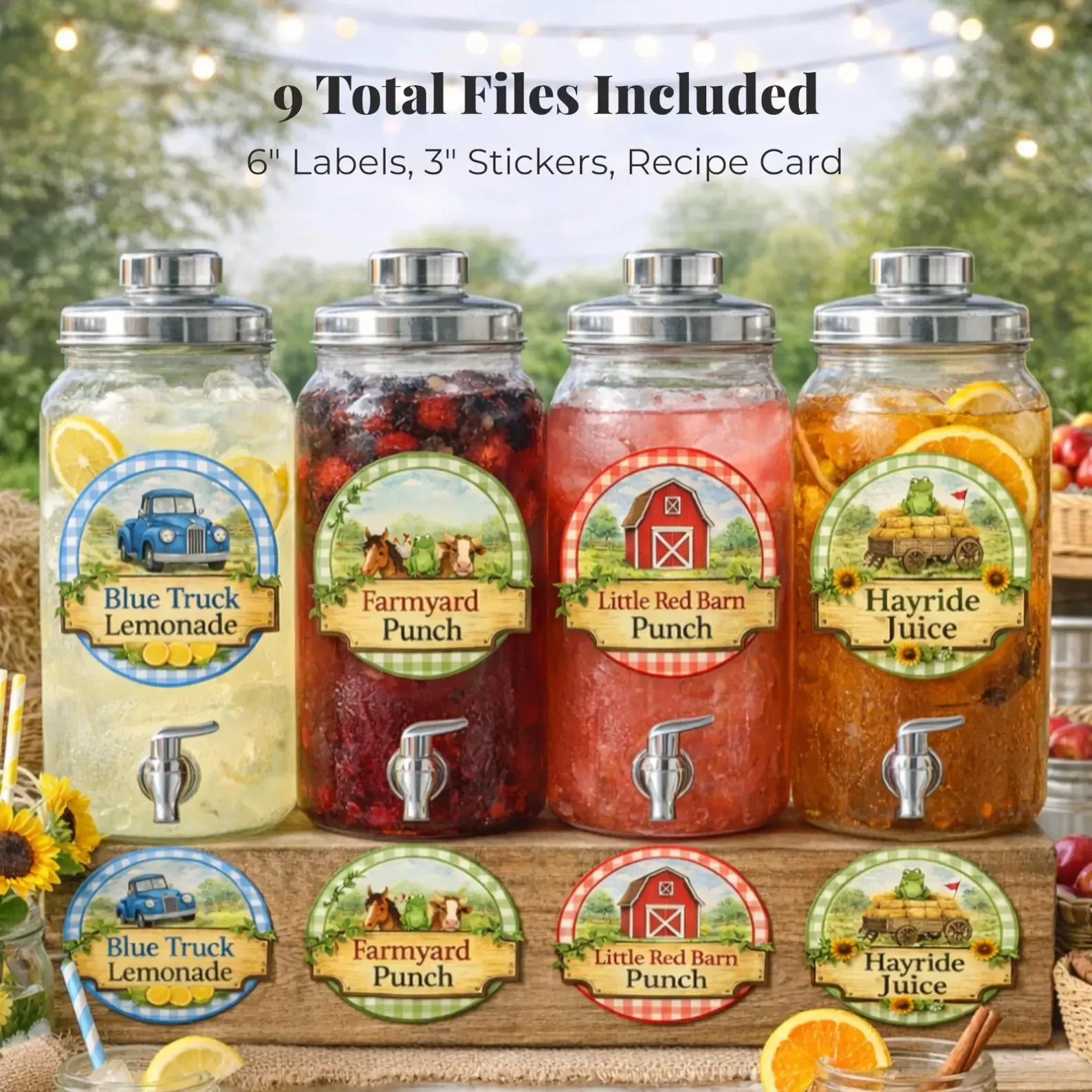If you want your drink station to look styled without extra decor, this printable does it instantly. The set includes four barnyard-inspired labels like Blue Truck Lemonade and Farmyard Punch, plus matching small labels for mason jars or favor bags. It pulls the whole party table together in minutes.