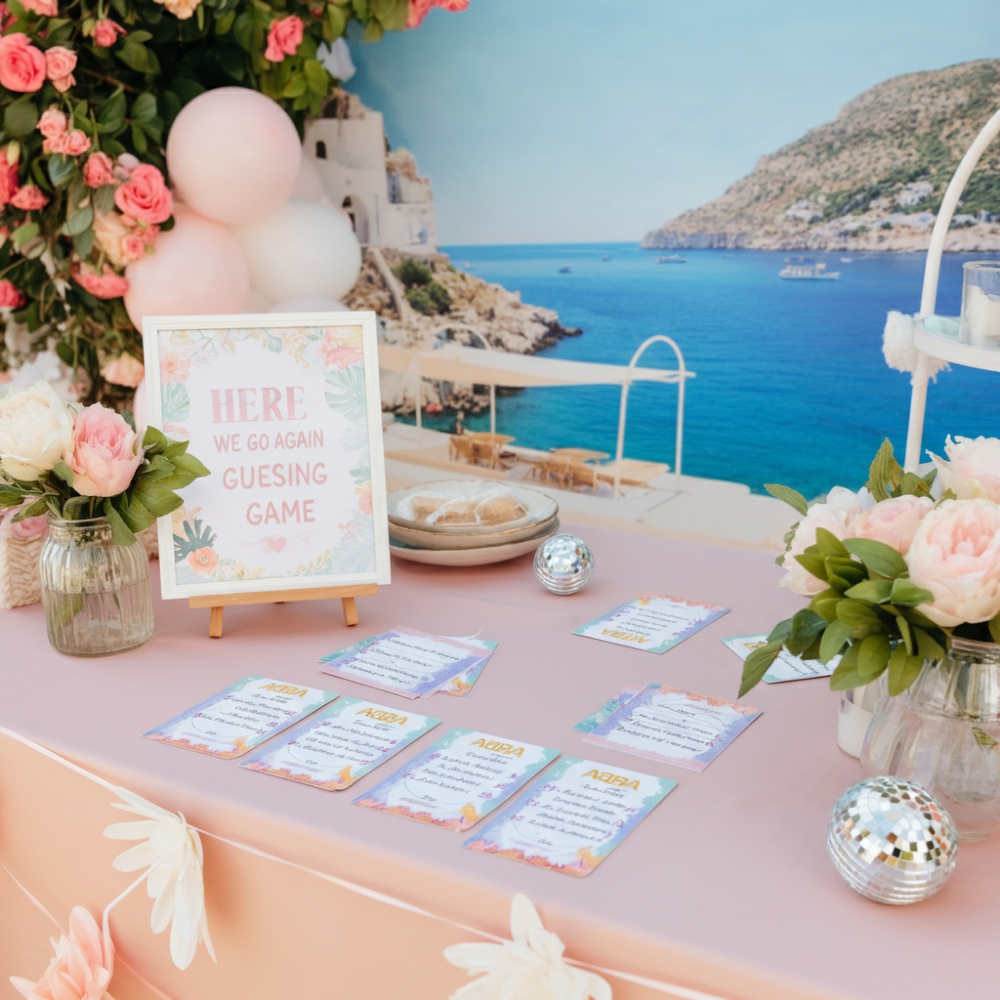A photo booth might not be a game, but it certainly belongs in your list of themed activities for a Mamma Mia bridal shower! Many Etsy sellers offer props and backdrops that can be shipped directly to your door, making it easy to get everything you need for your photo booth setup.