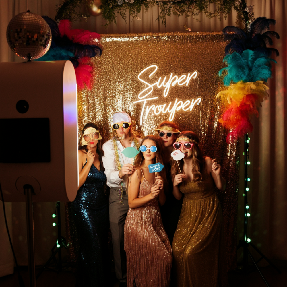 - Props like feather boas, oversized sunglasses, microphones, gold crowns, and disco-themed accessories.