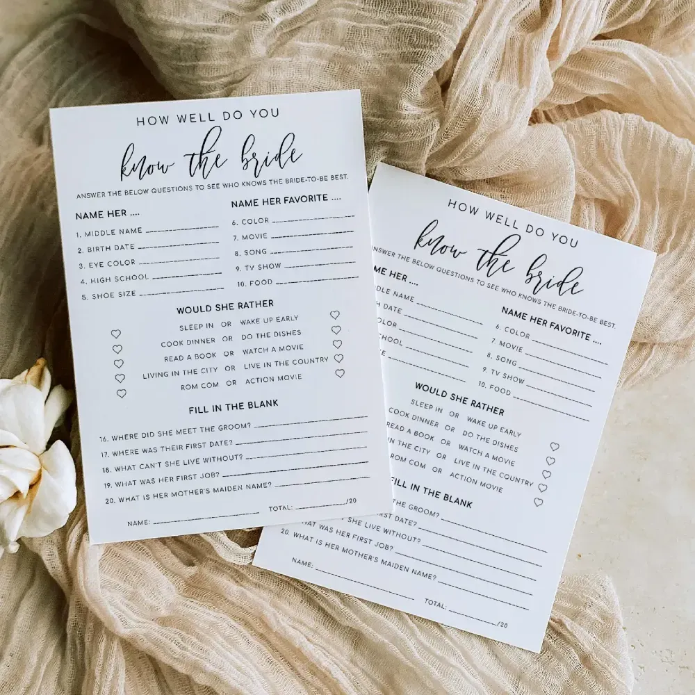 - Prepare a list of questions about famous celebrity weddings, bridal traditions, or even facts about your brideâs love story (perfect if you want to celebrate the engagement party vibe!).