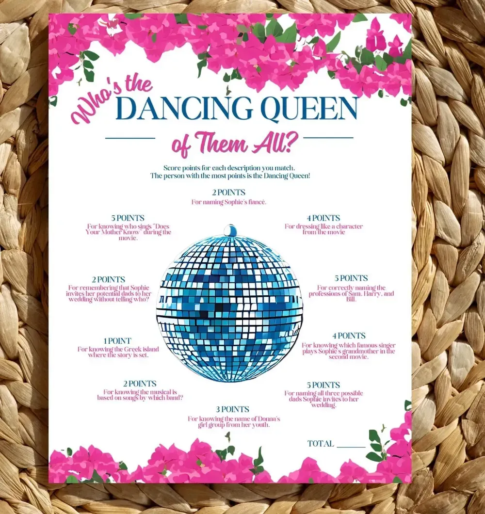 âWhoâs the Dancing Queen?â is a printable digital party game inspired by the music, dancing, and iconic fun of the Mamma Mia world. Players compete to be crowned the Dancing Queen Champion while engaging in musical challenges, trivia, and other ABBA-themed activities.