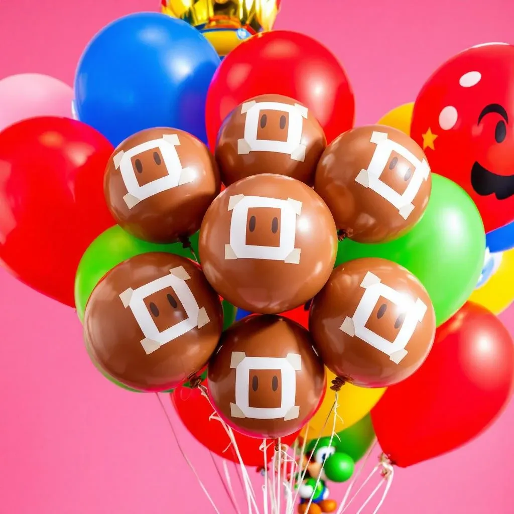 Turn balloons into characters by creating balloon Goombas with a simple goomba face drawn or printed and taped on. Mix in Mario, Luigi, and Princess Peach balloons for a playful look.