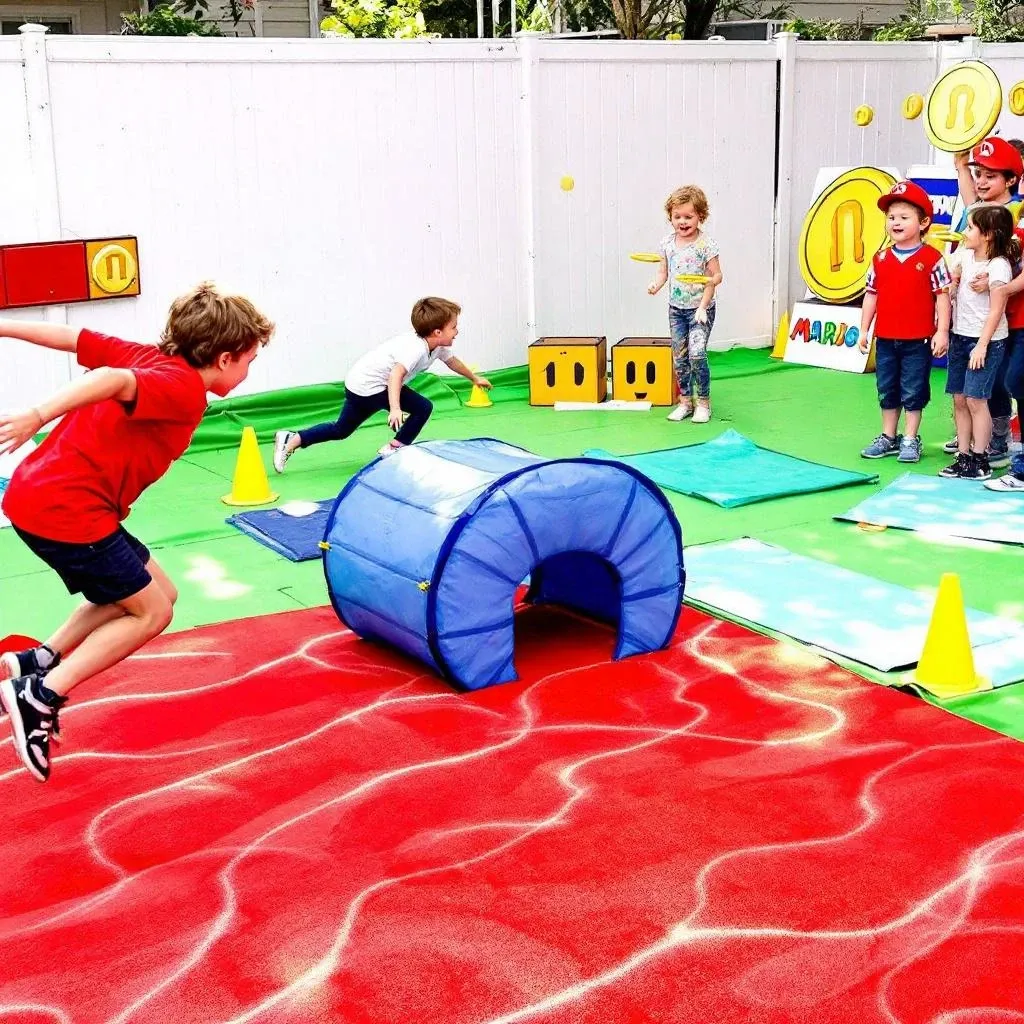 A Mario-inspired obstacle course is the heart of a mario game night birthday party. Use cones, boxes, tunnels, and tape to create a simple course where kids run, jump, crawl, and race to the finish.