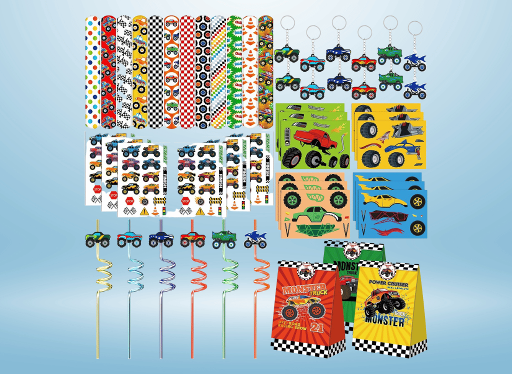 Our recommended Erweicet Monster Truck Party Favors Set is a great start. It includes slap bracelets, keychains, DIY stickers, tattoo stickers, and unique truck straws.
