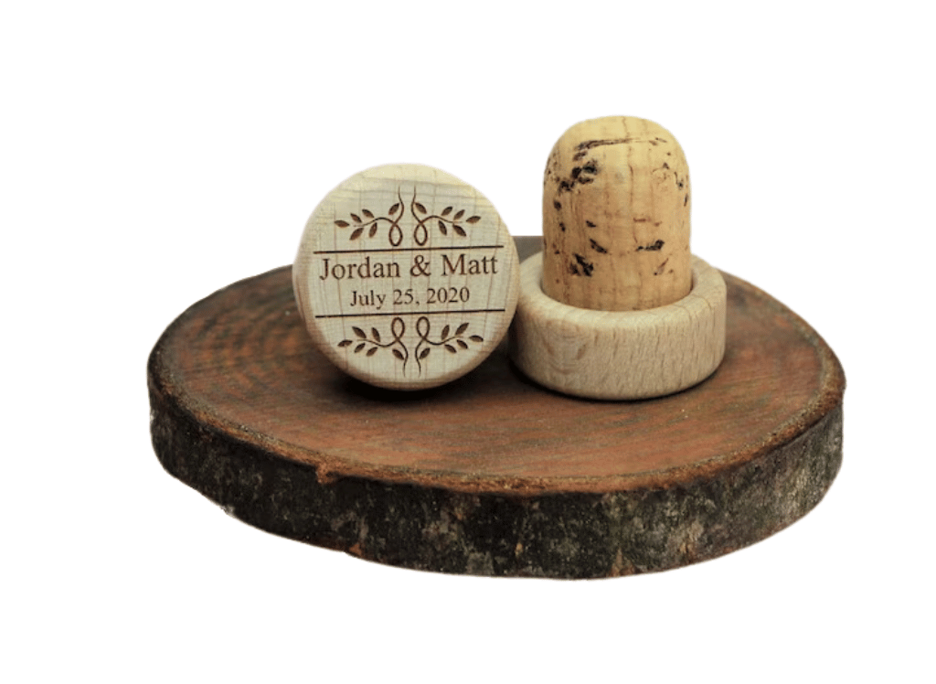 These aren't just ordinary stoppers, friends. Oh no, these are made from high-quality cork from Portugal and sustainable wood from our very own Mother Earth. They sand, glue, and then laser-engrave each piece to perfection, ensuring a lasting impression that won't fade with time. The end result? A remarkable wedding favor that fits snugly into standard wine bottles, and more importantly, into the hearts of your guests.