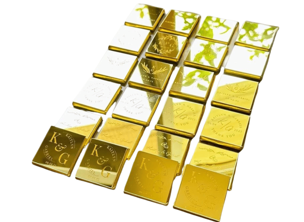 Designed with a touch of elegance, these chocolates make a statement with a gold or silver mirror finish, which adds a dash of sparkle to your wedding ceremony. But, that's not it – they take custom orders to have your name inscribed on each piece, turning them into personalized tokens of your love and gratitude. Oh, and did we mention the best part? They stay fresh for an entire year! So, whether your guests savor them right away or take them home as a keepsake, they're in for a delicious treat that lasts. Now how's that for a wedding favor that's as sweet as your love story?