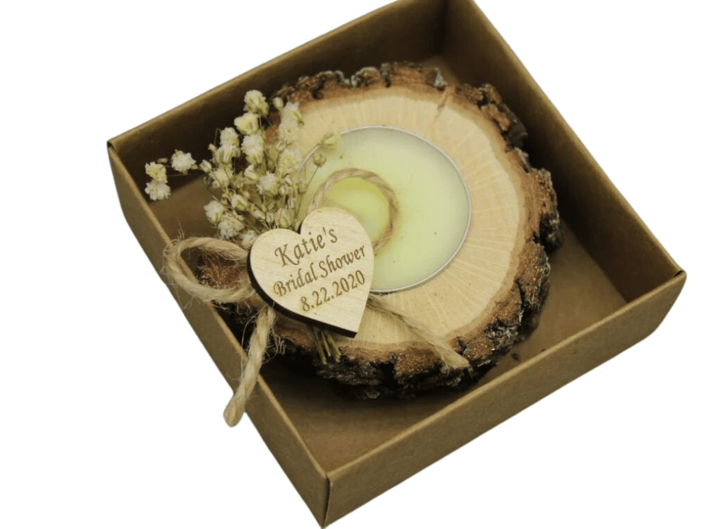 Many of the gifts featured in this article, like the Rustic Wedding Tealight Candle Holders and the Napa Wine Glass Tag, not only serve as wedding favors but also add to the décor of your wedding.