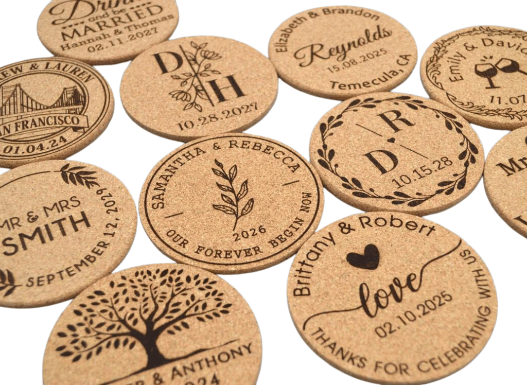 Not only are these beautiful coasters super practical, but they're also customizable. That's right – your names, your wedding date, or a heartfelt message, engraved on each coaster, making them a keepsake your guests will actually want to keep. But wait, there's more! Made from top-notch, earth-friendly cork, these coasters are all about giving a nod to Mother Nature. So, if you've been hunting for a stylish, meaningful, and eco-conscious way to thank your guests, these cork coasters got you!