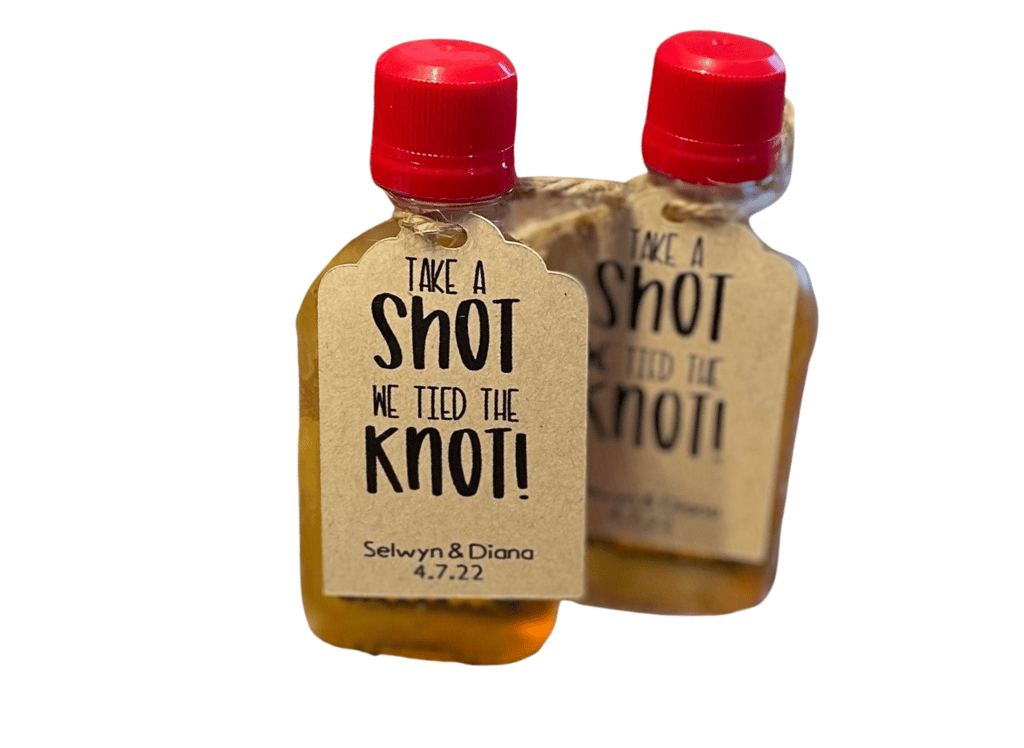 Get ready to raise those glasses, because 'Take a Shot We Tied the Knot' tags are just the thing to get your guests in the celebratory spirit! These whimsical, handcrafted tags come in a charming light brown or rye hue, adding a rustic touch to your wedding favors. And the best part? They're entirely customizable, allowing you to etch your names or a personal message of your choice. They're the perfect size to hang from your favorite spirit bottles, inviting your guests to join in the toast.