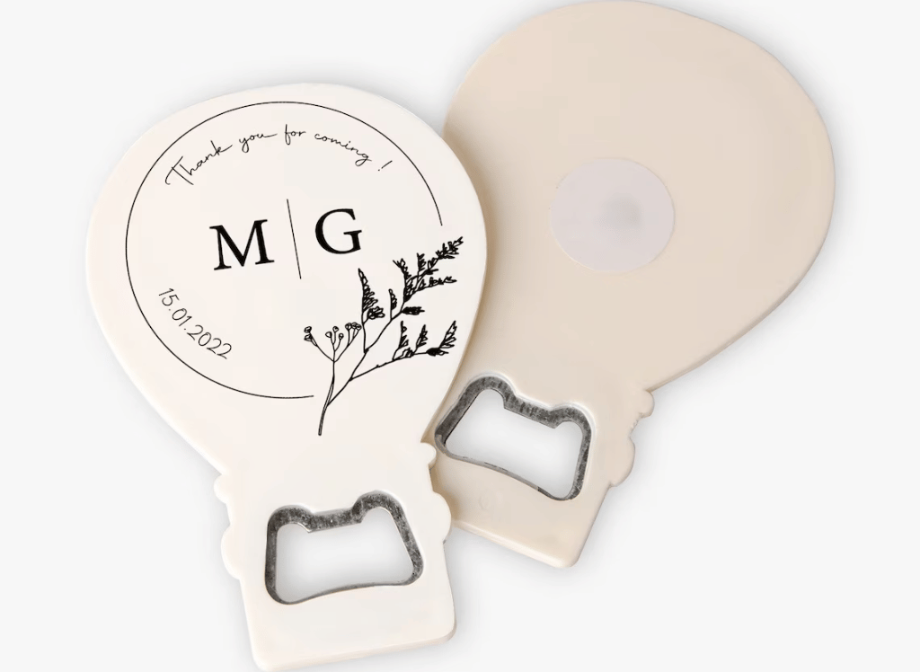 Each bottle opener flaunts your names etched on the surface, turning a simple bottle opener into a personalized memento of your special day. But here's the kicker - they also double as magnets! That's right, your guests can stick these gems on their fridge, reminding them of your love-filled celebration every time they open a cold one. Made with top-notch quality and a dash of love, these bottle openers are sure to make your wedding pop!