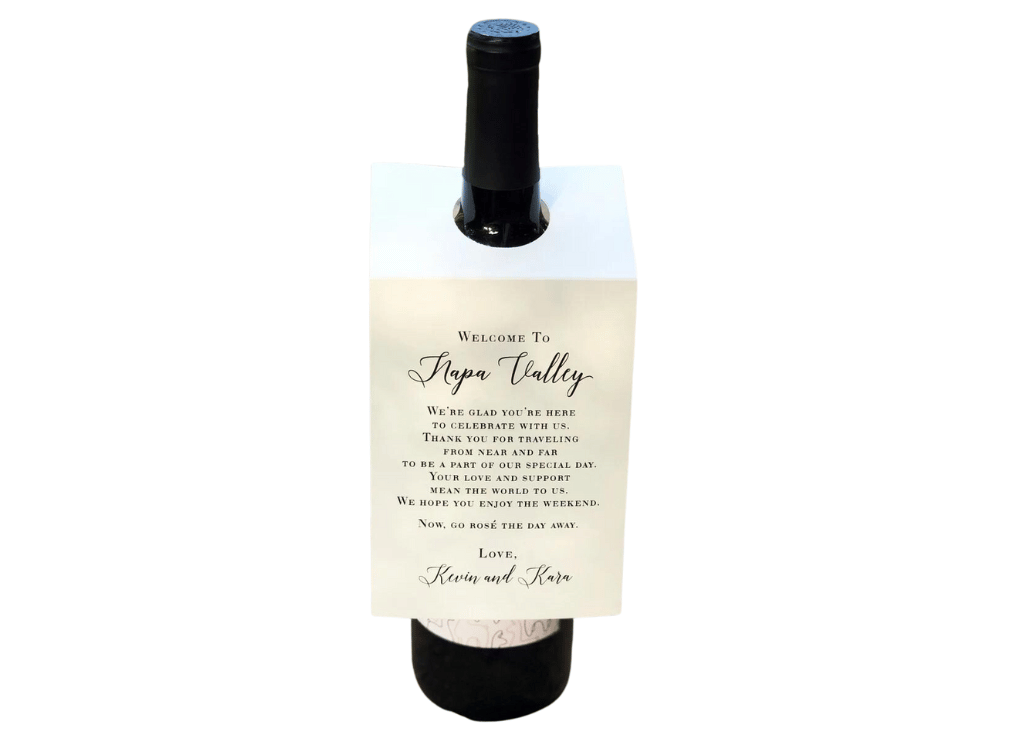 If you're tying the knot in the heart of wine country, we've got a pick that'll have your guests bubbling with excitement - the Wedding Welcome Wine Bottle Necker with Timeline! Imagine this: your favorite local Napa wine, dressed up with a stylish necker that doesn't just add a pinch of glam, but also serves a practical purpose. Printed right on the back is your wedding day timeline, so your guests know exactly when and where to bring on the cheer. It's not just a wine bottle, it's your very own party guide! Slip it on, let it hang, and voila - your wedding favor is also the life of the party!