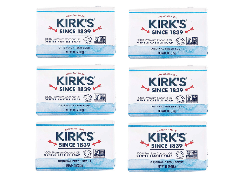 Kirk's Castile Bar Soap is the perfect choice for gentle, yet effective cleansing of all skin types. Made with 100% premium coconut oil, this vegan bar soap creates a creamy lather while providing deep moisturizing and antioxidant-rich nourishment to dry, irritated skin. A great choice for those looking to avoid harsh toxins and chemicals in their skincare products, Kirk’s Castile Bar Soap is free of Sulfates, Parabens, Phthalates, EDTA, Colorants, Gluten and more; making it suitable for even the most sensitive skin. Available in Original Fresh Scent as well as Fragrance Free/Unscented and Aloe Vera varieties – Kirk’s Castile Bar Soap provides a safe and natural solution to your everyday cleansing needs!