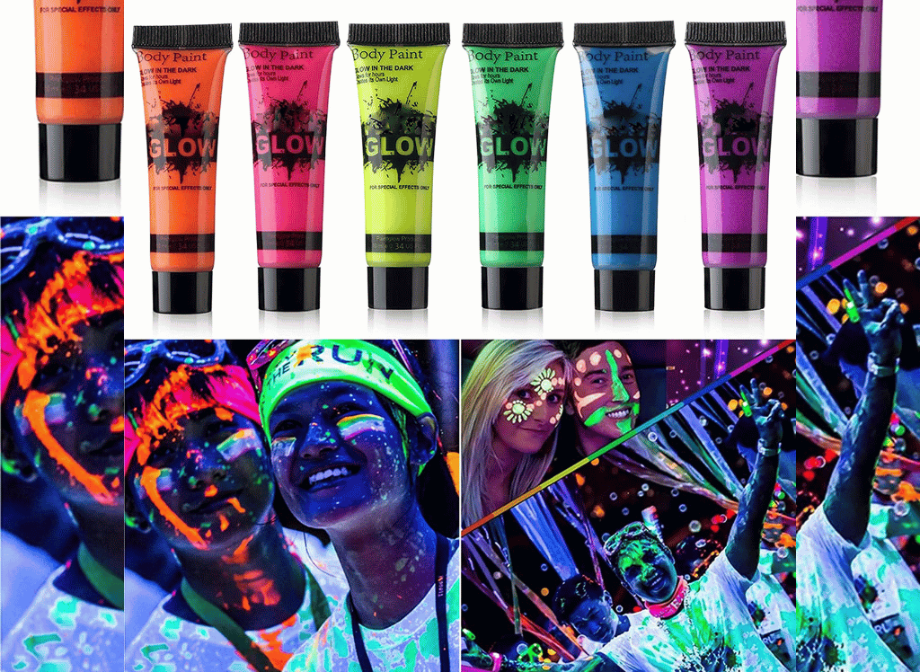 GARYOB 6 Glow in Dark Face and Body Paint is a great way to take your events from day to night. This versatile paint set includes six vivid colors - red, blue, green, yellow, orange and purple – conveniently sized at 0.34oz (pack of 6). Each color glows brightly under UV lighting for extra visibility during nighttime celebrations and activities. The paints are also suitable for use during the day as they easily apply and dry quickly on the skin while lasting all night long – simply wash off with water when you’re done!