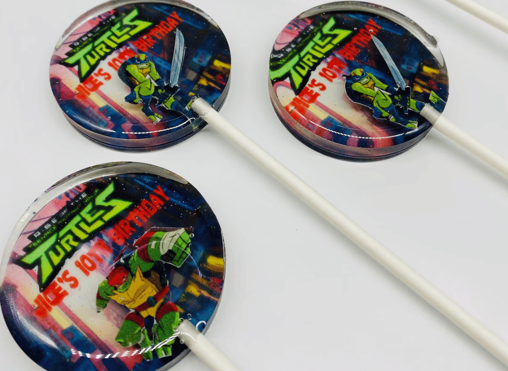Crafted with love by TheLollipopStudio on Etsy, these treats are a hit with kids and adults alike, packing a punch of fruity flavor that's as bold as a ninja's stealthy strike. Don your bandana, because these lollipops are about to lead your taste buds on a totally radical adventure! 🍭🐢✨