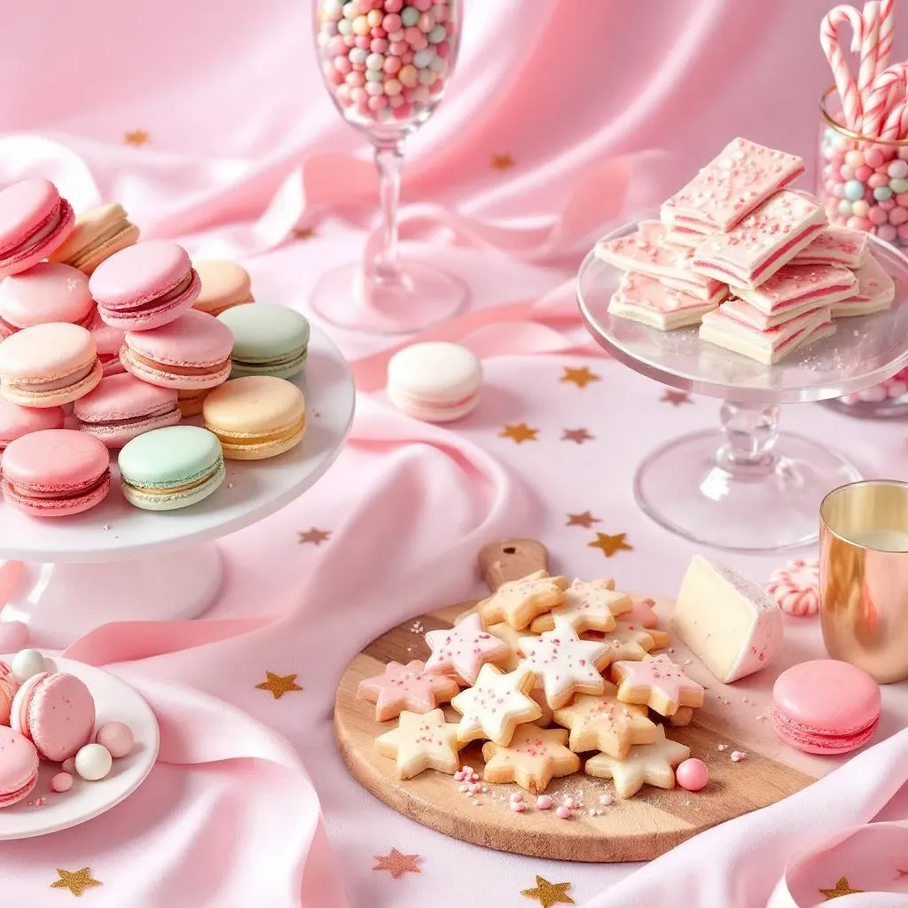 Focus on creating a "Land of Sweets" dessert bar featuring macarons, peppermint bark, sugar cookies, and treats in your party colors. Add candy-cane stir sticks to drinks and serve everything on cake stands for elegant presentation. Don't forget savory options like finger sandwiches or a cheese board to balance the sweets.
