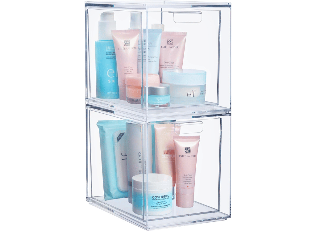 Love keeping your beauty products organized? These stackable clear plastic drawers are just what you need! Made in the USA using durable BPA-free plastic, the Audrey organizer features two drawers that slide open smoothly on integrated rails.