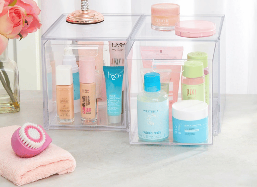 Pop your perfumes, lotions, makeup brushes, and more into these crystal clear bins. With dimensions of 6 inches wide, nearly 8 inches deep, and almost 7 inches high, they provide ample tidy storage that looks sleek on shelves, counters, or tucked away inside cabinets.