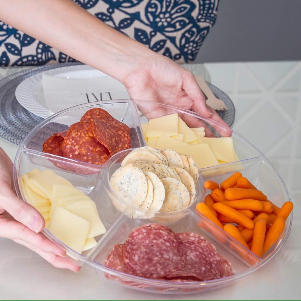 To keep your snacks well-organized, try using the Plasticpro 6 Sectional Round Plastic Serving Tray. These trays are perfect for separating different treats and make serving easy and mess-free.