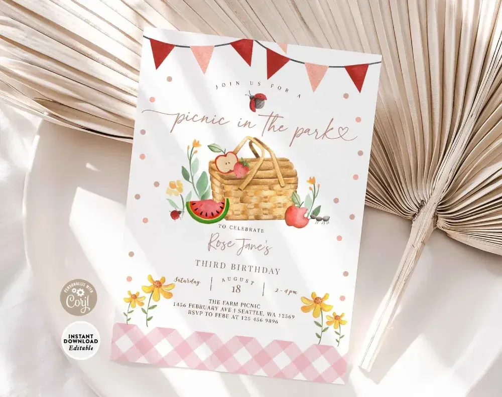 Nothing sets the tone for your picnic like sending well-designed invitations! Providing clear details in the invitations, such as the theme and style of the picnic, can enhance the overall atmosphere and ensure attendees know what to expect. Go for customizable and fun digital invitations, such as an editable âPicnic in the Park Birthday Invitationâ template. These are not only eco-friendly but also make it easy to match your party theme perfectly.
