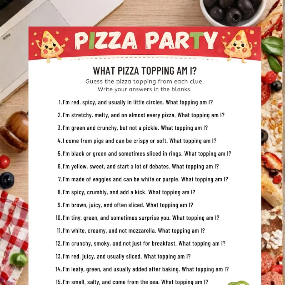 This easy guessing game is a great icebreaker for a pizza party for kids. Each player reads a short clue and tries to guess which pizza topping is being described. The rules are simple, the setup is minimal, and the game works well for a wide range of ages.