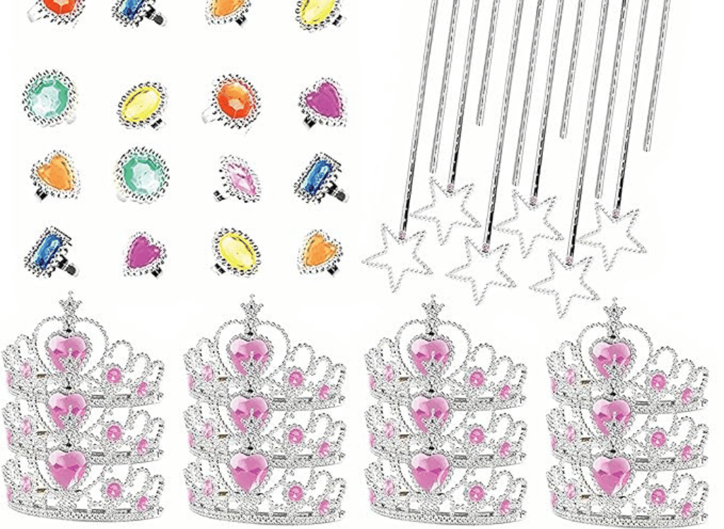 Girls will feel like royalty with these beautiful costume pieces that ignite their imagination. The 12 tiaras, 12 magical wands, and 24 sparkling rings make perfect party favors to delight every young princess. As the birthday girl and her friends roleplay together, they’ll create magical memories while developing essential skills. Watch their faces light up when you bestow these thoughtfully designed dresses, princess crowns and accessories upon your little princess and her guests. With details crafted to make them look and feel like royalty, these dress-up favors unlock endless magical fun for the kingdom!