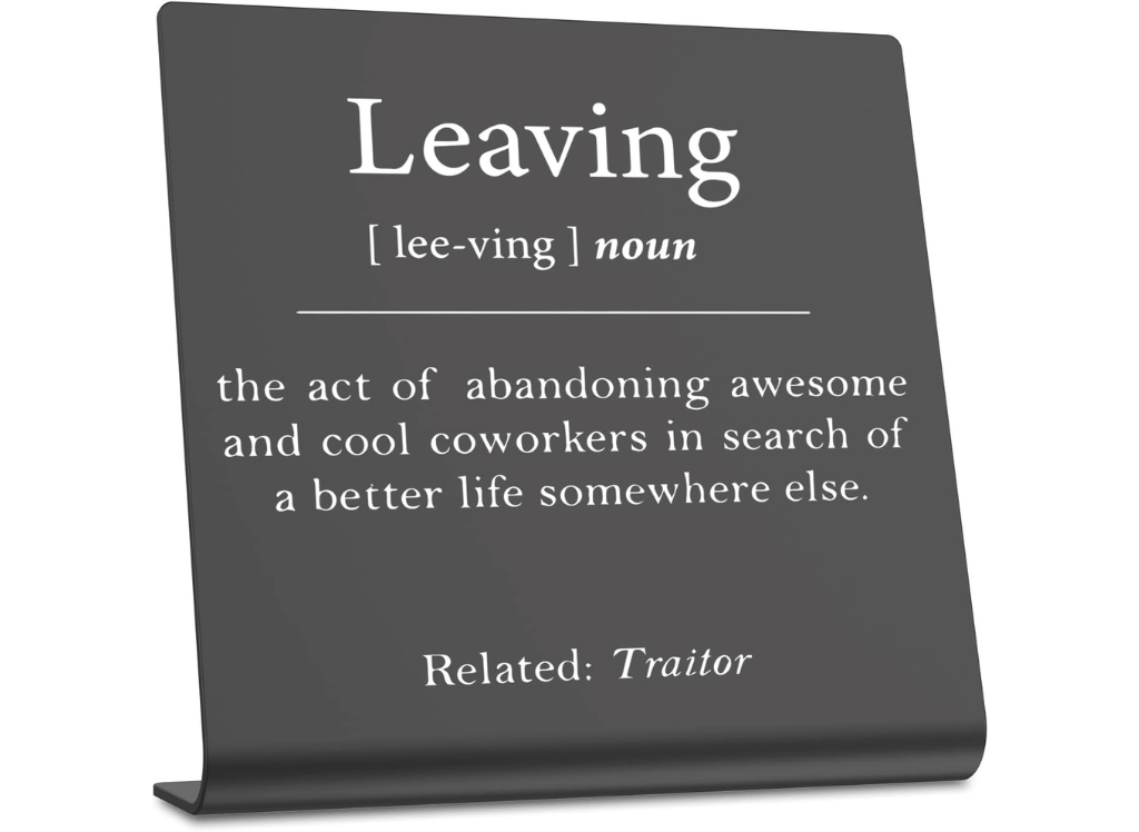 Get ready to bid adieu to your coworker in style with the TRCENDE Farewell Sign! This nifty little 4"x4" gem packs a whole lot of love and laughter. Just imagine their face when they see the witty definition of 'Leaving' - "the act of abandoning awesome and cool Coworkers in search of a better life somewhere else". And the best part? It's made from solid stainless steel, so it’s as sturdy as your bond. Whether it adorns their new office desk or their coffee table, this sign will remind them of the good times shared, the laughs, and the camaraderie. It's not just a farewell gift—it's a token of love, appreciation, and a whole lot of fun!