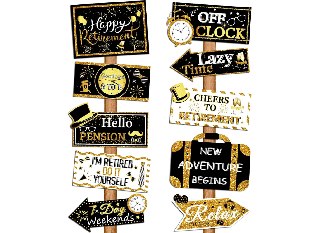 This pack is a carnival of creativity with 10 different styles, each more fun and vibrant than the last. Made from sturdy, durable card stock that just won't quit, these signs are the life of the party. And let's talk size - with a range from 10.6 x 3.8 inches to 10.7 x 5.9 inches, these signs are stunning showstoppers. Whether you're proudly declaring "goodbye 9 to 5" or signaling the way to the punch bowl, these signs will add that touch of whimsy and charm that every retirement party needs.