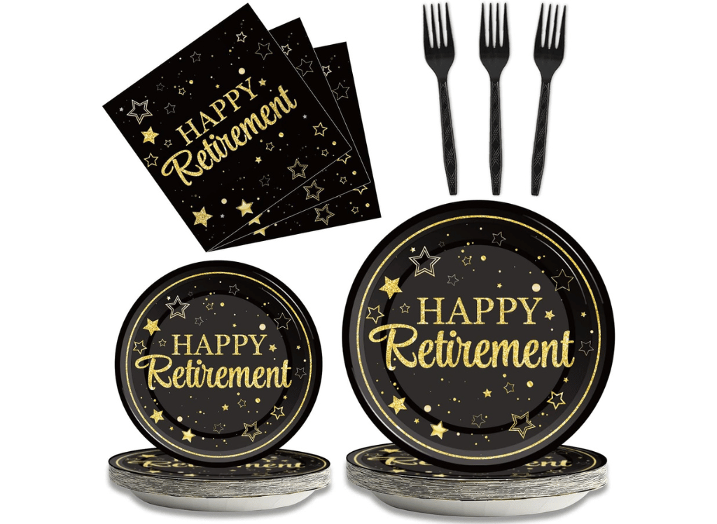Every piece in this set is all about quality, style, and oodles of fun. Made with top-notch, non-toxic paper, these plates and napkins are not just durable, they're also heat-resistant. And the designs? Talk about a riot of black, gold, and happy retirement patterns! This kit is the ultimate party sidekick, blending seamlessly with your other retirement decorations—from banners and tablecloths to bags and backdrops. With enough goodies to serve 24 awesome guests, your retirement party table will look nothing short of stunning.