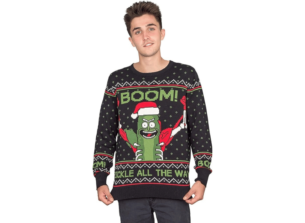 3. Ripple Junction Rick and Morty Boom! Pickle Rick Adult Ugly Christmas Sweater