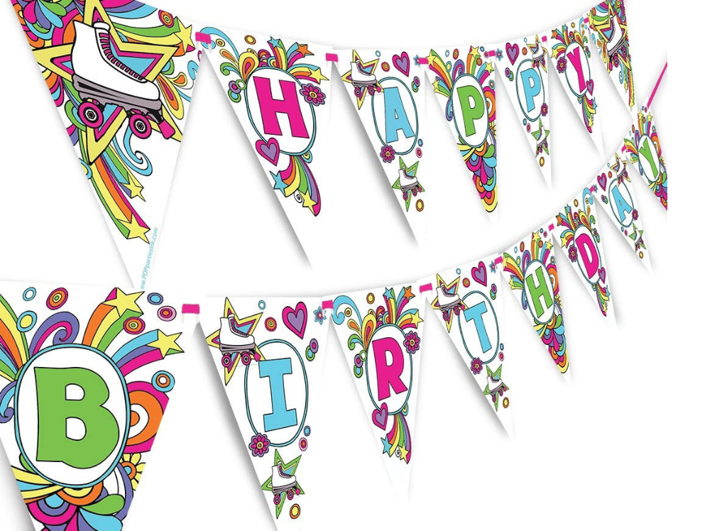 Introducing the POP Parties Roller Skating Rainbow Happy Birthday Banner Pennant! Decorate your birthday celebration with a festive and fun decoration that is sure to make it one to remember. This kit includes 15 paper pennant flags spelling out "Happy Birthday" plus two end pieces featuring colorful roller skates, perfect for any kid or adult who loves skating. With bright colors and eye-catching shapes, this banner will bring energy and fun to the festivities of your special day.