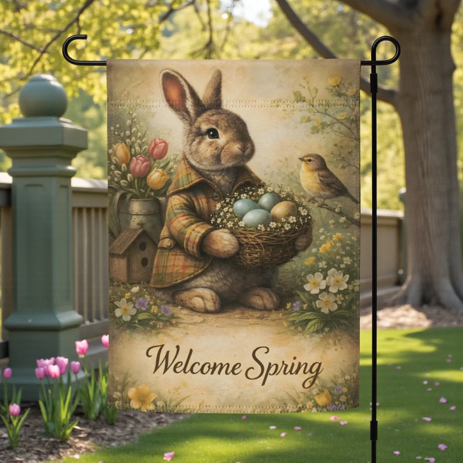 This welcome garden design focuses on soft spring floral elements, warm color tones, and a classic cottage-inspired bunny illustration that instantly feels inviting.