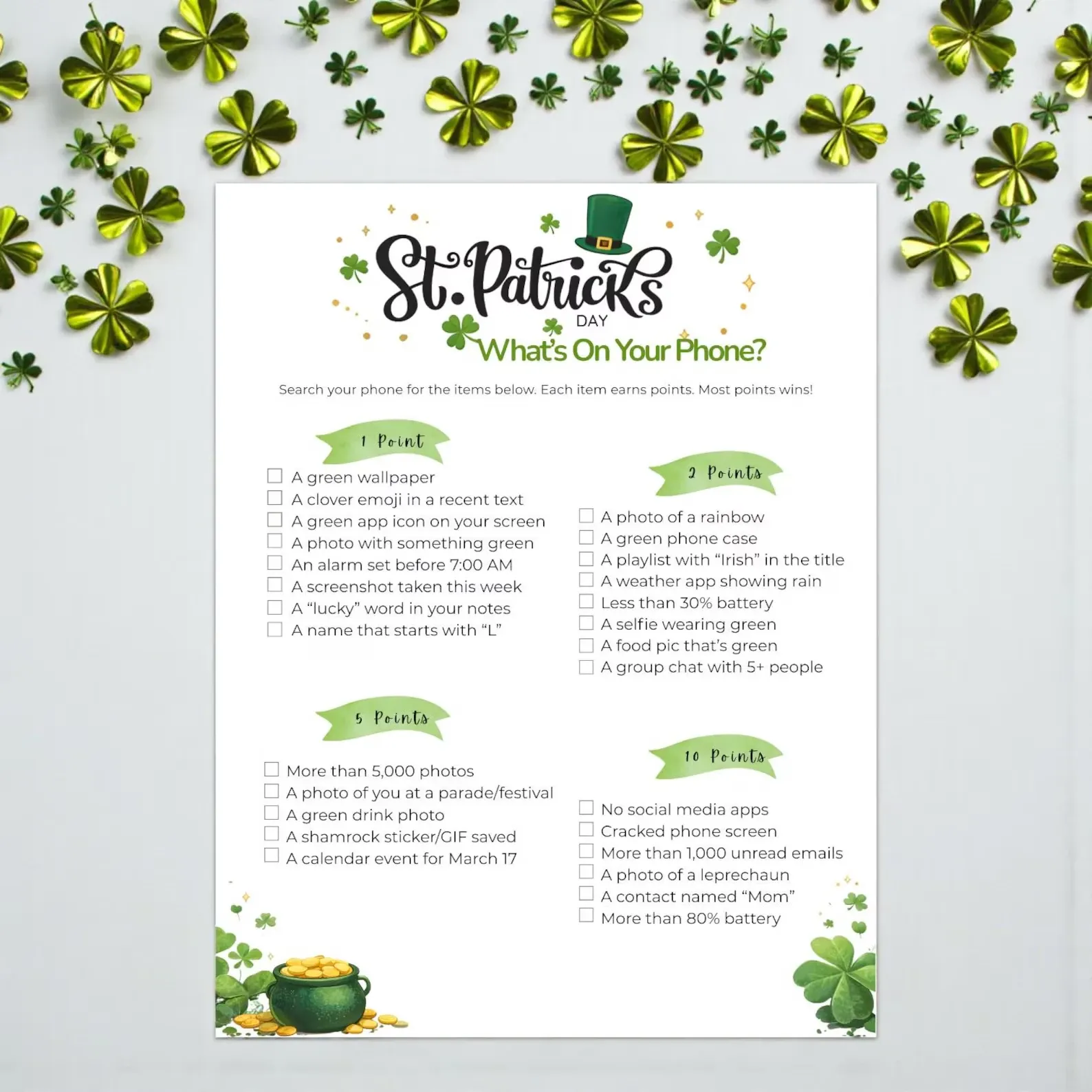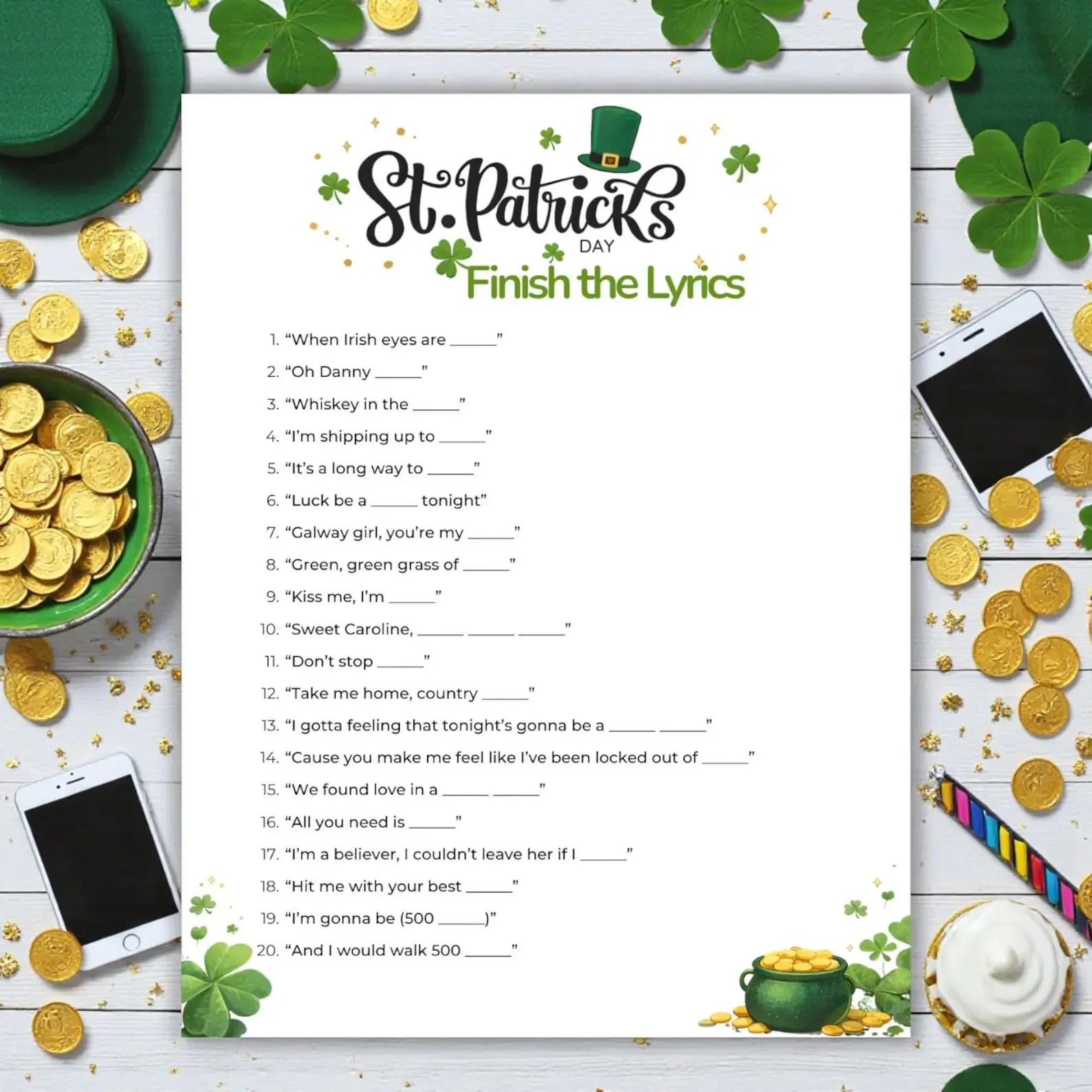 From a hilarious Finish the Lyrics challenge to a scavenger hunt style phone game, these Patrick’s Day game ideas make celebrating St Patrick’s Day effortless and fun.